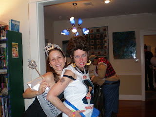 Rick and I decided we would mask as Dr. B's "true" parents. The premise: Unfortunately, Dr. B has been less than honest about his humble beginnings. His real Maw and Paw Mull-ette showed up, with little sister, Furrleen, in tow to "out" him. The sad and sordid truth this halloween night, Dr. B was born DeWayne Mull-ette from Pea Falls, Arkansas. DeWaynes picture is on my water bottle, on our t-shirts, stapled on my pants pockets and on Rick's koozie.